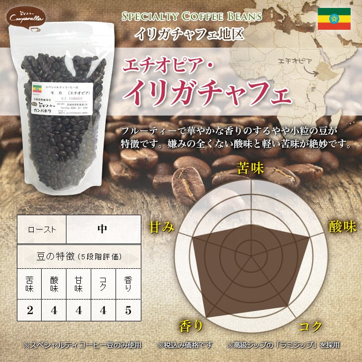 イルガチェフェはエチオピアのシダモ地方、標高2000m前後の地名のことです。摘み取り後、天日干しする前に実を丁寧に水で洗って不純物や余計な外皮を落とすウォシュド処理。雑味が抜けスッキリした味わいに仕上がります。